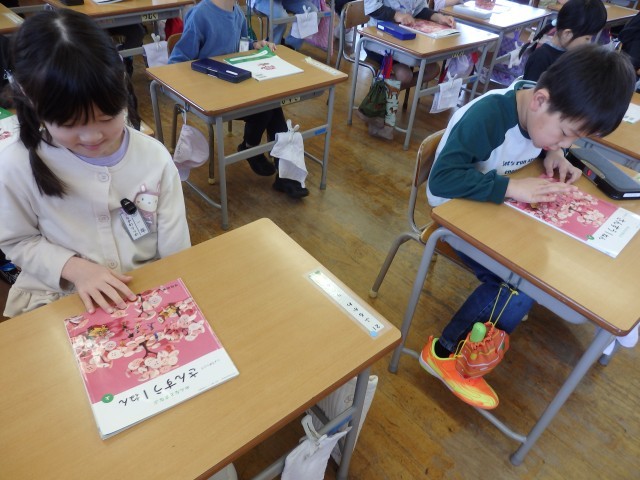 1年生の4時間目は音楽の授業でした。「君が代」と「大空が迎える朝」という歌の練習をしていました。しっかりと口を大きく開けて一生懸命歌っているのがよく分かりますね。