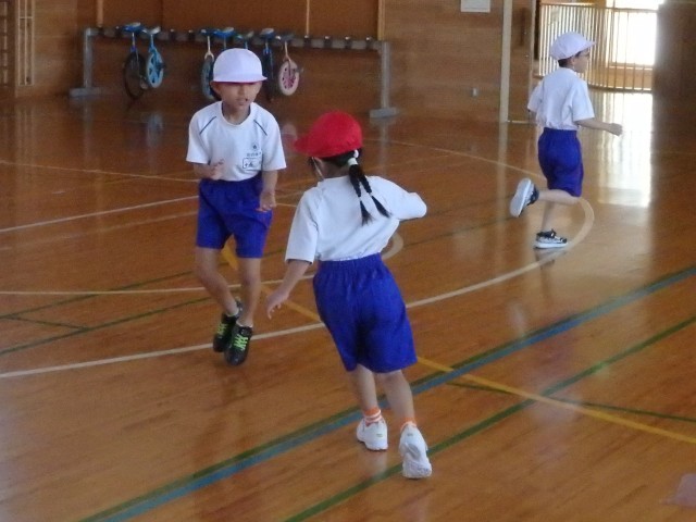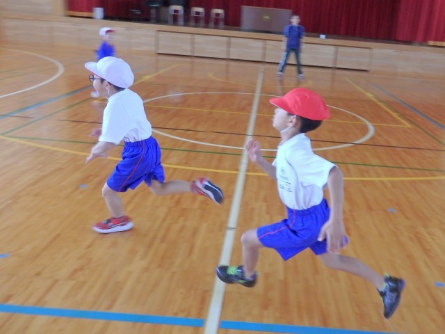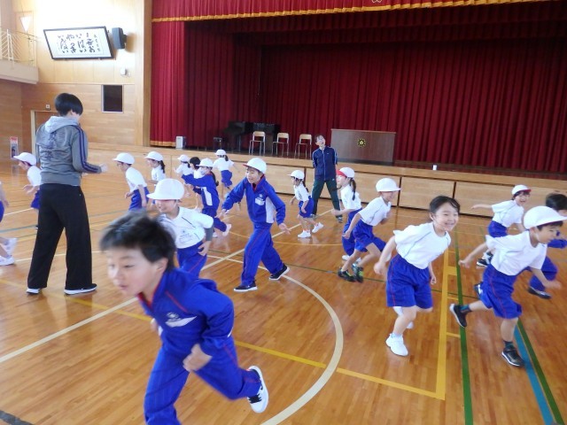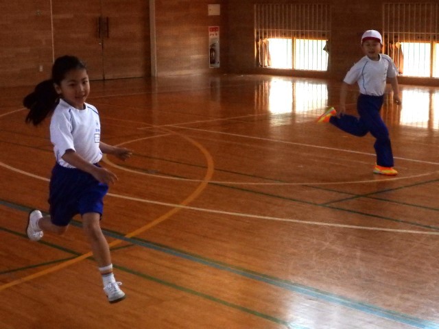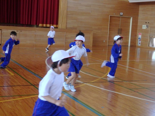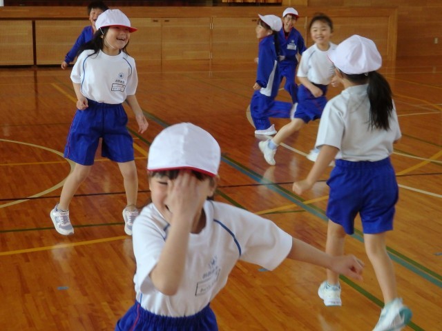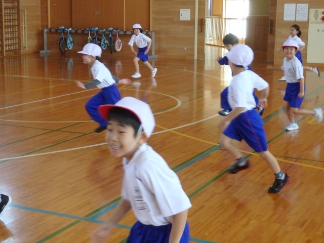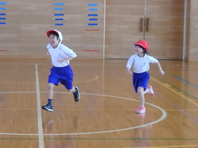 1年生の2時間目は体育の授業でした。きちんと「まえならえ」で整列することができました。今日はオニごっこの「ふえオニ」で広い体育館を思いっきり走りまくりました。1回戦は先生がオニ、2回戦は「オニがやりたい!」という子がたくさんいたのでジャンケンでオニを決めました。笑顔いっぱいで楽しんでいました。