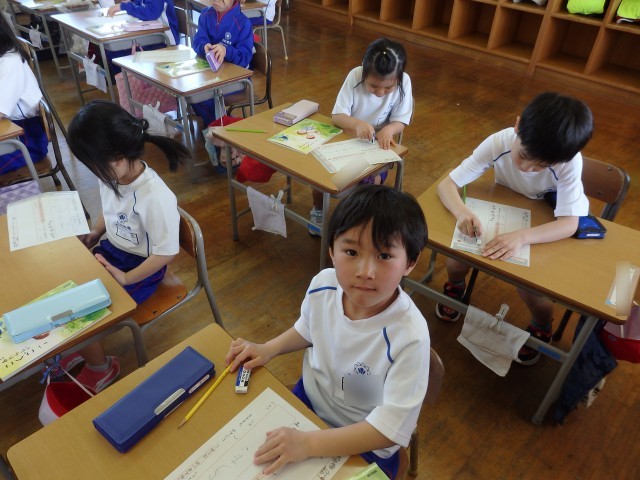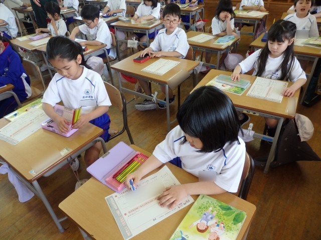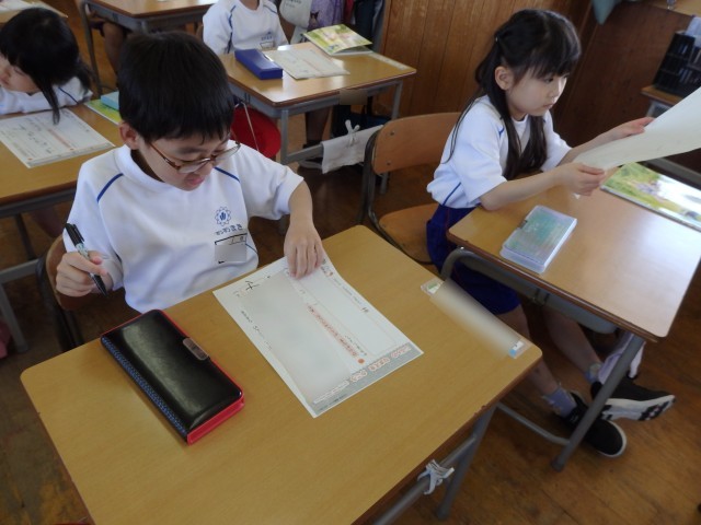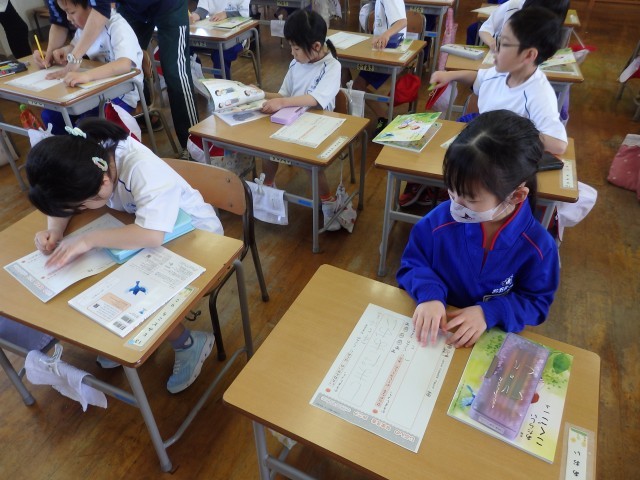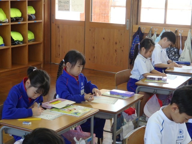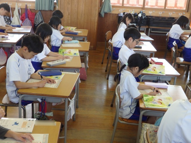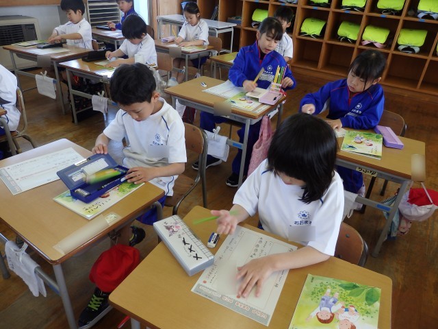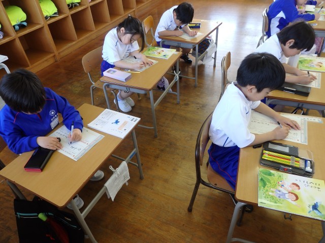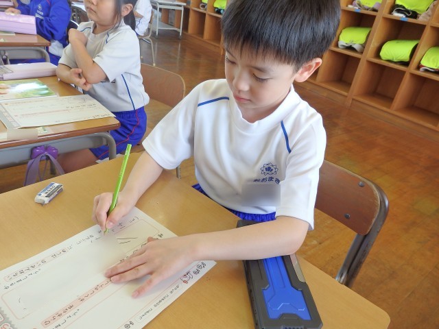 1年生の4時間目は書写の授業でした。静かに書写ノートに取り組んでいました。おしゃべりをする人がなく、シーンと静まりかえった中で集中して取り組んでいました。書く姿勢がいい子がたくさんいました。
