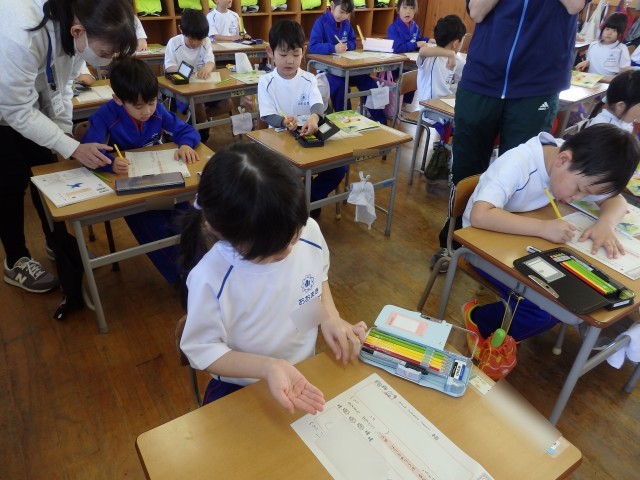 1年生の2時間目は学活の授業でした。「いいねカード」が配られました。学校生活の中で先生たちが子どもたちのいい姿、頑張っている姿などを見つけたときにあげるシールを貼るカードです。カードを後ろの人に手渡すときに「どうぞ」と一言添えて、受け取る人も「ありがとう」と一言返します。とってもいいですね。さらに先生が「ていねいに名前を書きましょう」と言うと、どの子も一生懸命に書いていました。さっそく全員にシールが1枚ずつ渡されました。
