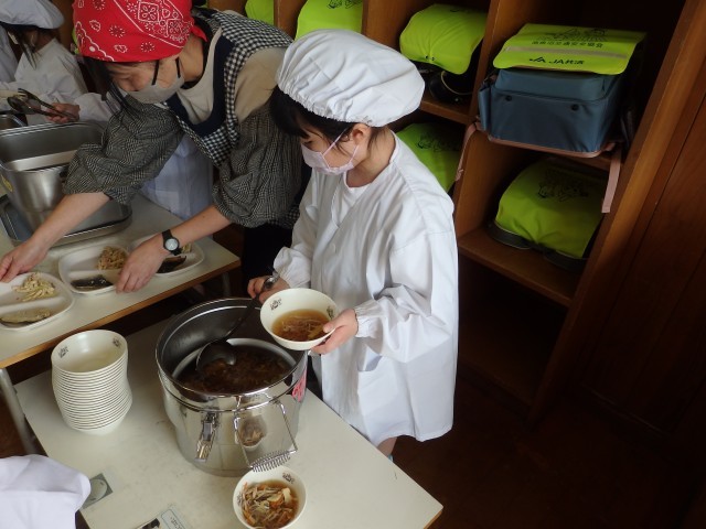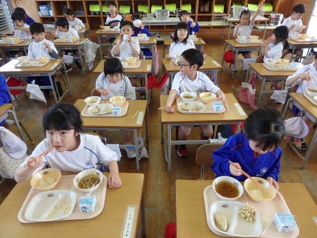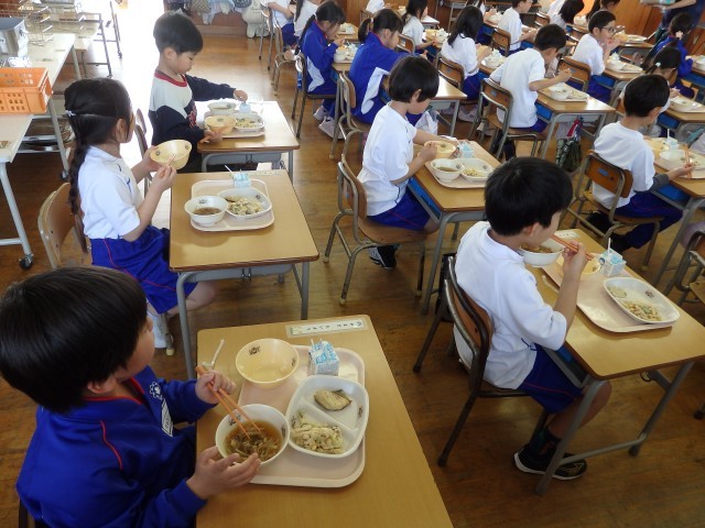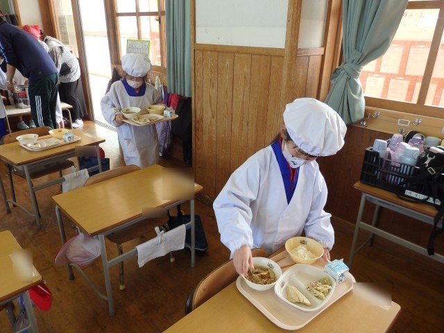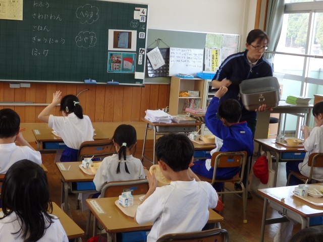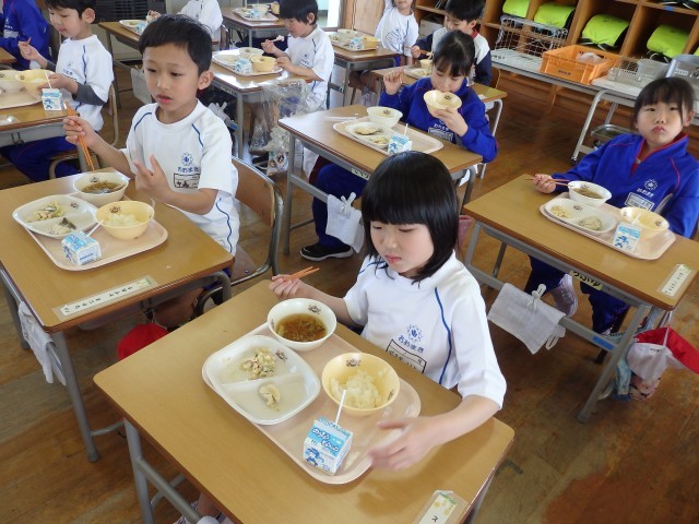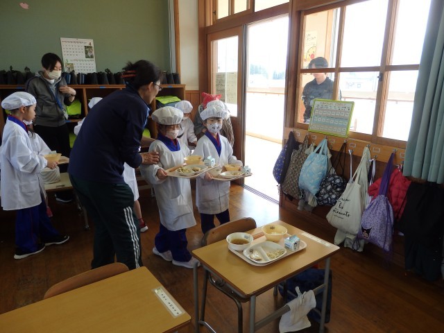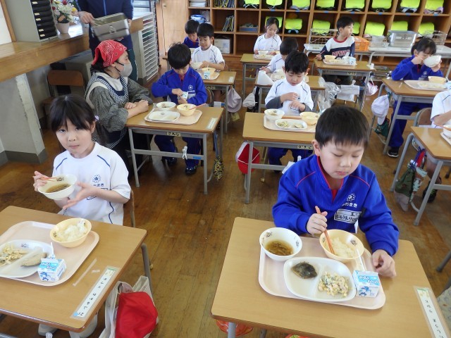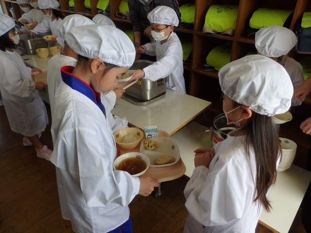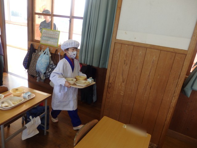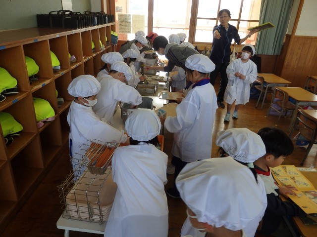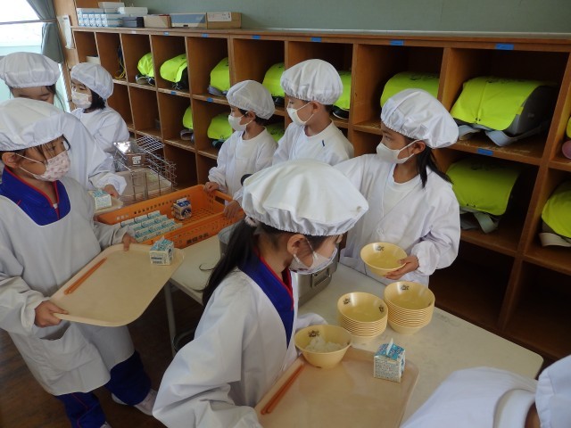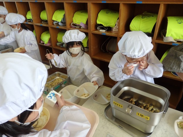 1年生は今日から給食がスタートです。今週給食当番の子たちが盛り付ける人と配る人に分かれて準備をしていました。初めての給食当番でしたが、準備が早くできました。