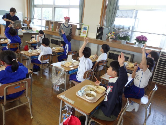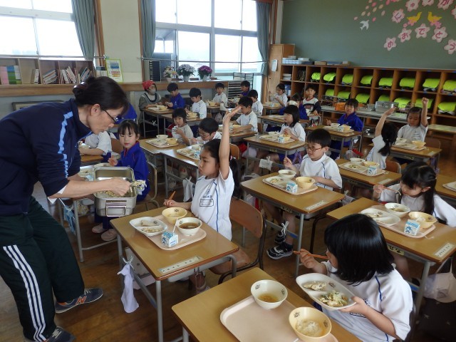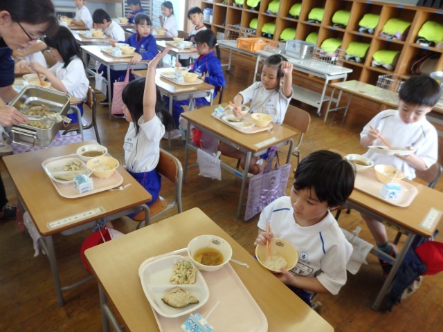 1年生のはじめての給食です。先生が食缶に残っているご飯やサラダ、お汁を「まだ食べたい人?」と聞くと「ハイッ!」と手を挙げる子がたくさんいました。まだ食べたいときに「食べたい」と言えたり、気軽にお替わりができる。それも「安全で安心な学級」のひとつです。