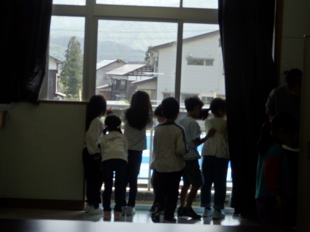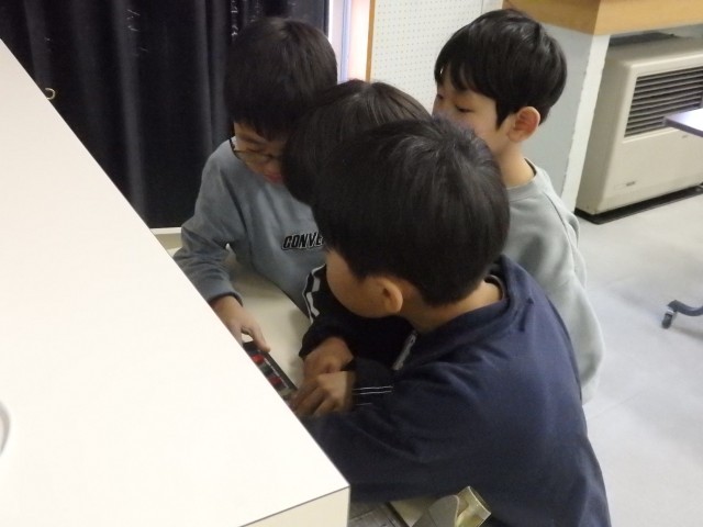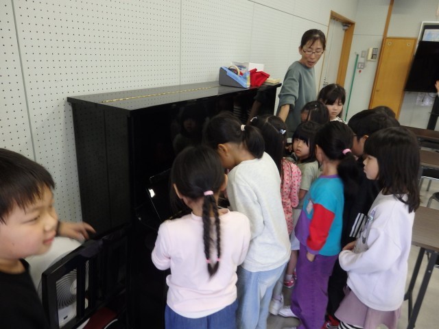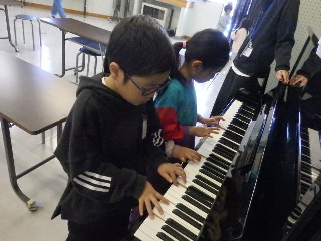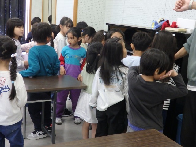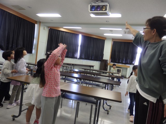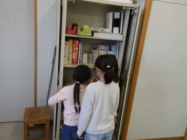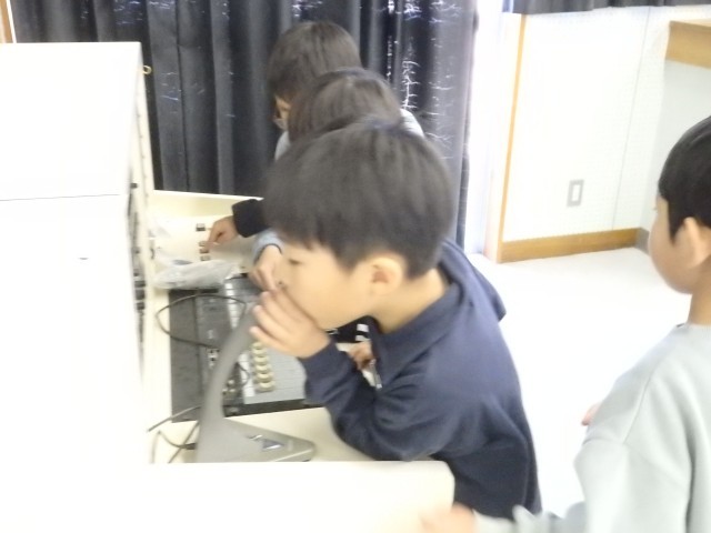 1年生の4時間目は生活の授業でした。学校探検をしました。今日は国際科室を探検しました。発育測定の時に入りましたが、今日は教室の中にあるいろいろな物をよく見たり触ったりしました。中学校の時代からある視聴覚機器に興味津々。触っているうちにスクリーンが降りてきてビックリする子どもたちでした。ピアノを弾いてみたり、窓から見えるプールを眺めたりもしました。最後は後ろのドアで繋がっている多目的スペースに出ました。
