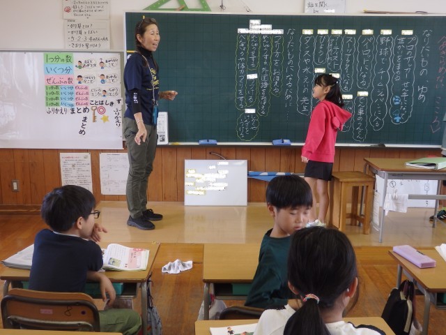 2年生の4時間目は国語の授業でした。まずはお手玉を使って頭と体をほぐしてリラックスするための運動をしました。足の甲に乗せたお手玉を、足を蹴り上げて空中に浮かせてキャッチします。蹴る足を変えたり、キャッチする手を両手にしたり片手にしたりしながら行いました。「できた!」とうれしそうに担任の先生に報告する子どもたちでした。その後、先生による絵本の読み聞かせをしました。