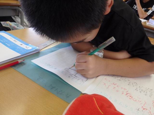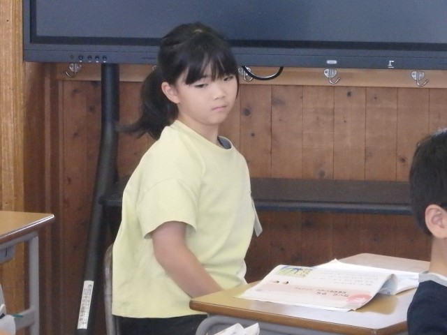 2年生の4時間目は算数の授業でした。水のかさの学習です。「ペットボトルに1L3dL、ビンに2L5dLの水が入っています。合わせた水のかさは?」という問題に取り組んでいました。発言がどんどんつながり、「単位をそろえて計算する」「単位ごとに計算する」ことが分かりました。また、そこから「長さの計算と同じだ」ということも分かりました。姿勢良く話が聞けている子がいました。いいですね!