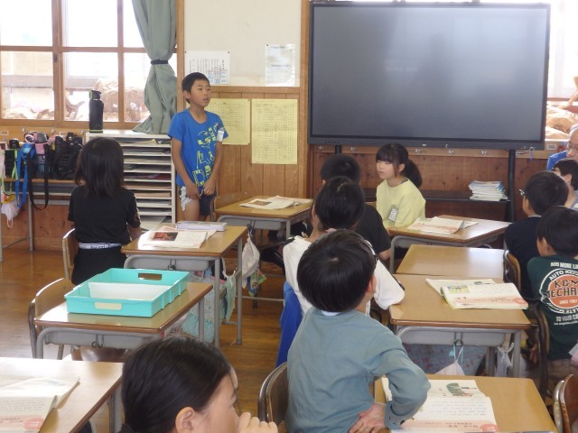 2年生の4時間目は国語の授業でした。「みんなで話し合おう」の学習です。前回の授業で「おすすめの本」を紹介する内容を考え、先生に発表していましたが、今日は班ごとでの発表です。お互いのおすすめの本を紹介し合ったり、質問し合ったりしていました。