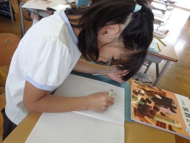 2年生の5時間目は国語の授業でした。ドリルを使って漢字の学習です。「万」「切」「語」などの漢字を学習しました。「万」の例文で「万年筆」という子どもたちには馴染みのないことばが出てきたので、先生が自分の万年筆を見せて紹介していました。その後、空書きで書き順を確認してから、ドリルで書く練習をしていきました。