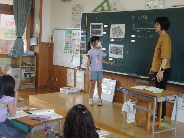 2年生の2時間目は算数の授業でした。かけ算の学習です。まずは復習で均等に並んでいる机やロッカー、いくつかのカゴに入っているリンゴの数をかけ算を使って数えました。その後、ノートに横3cmの長方形を2つ繋げて描き、その図から分かることを発表していきました。「3cmが2つ」「3×2で6cm」という考えが出されたところで、「2倍」ということばを学びました。