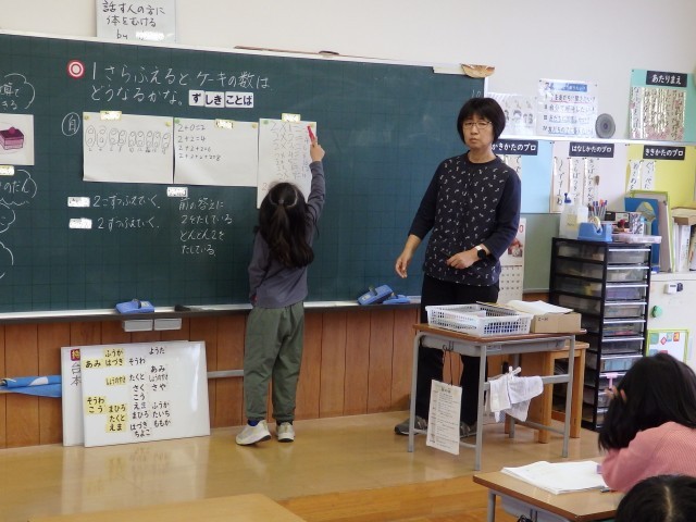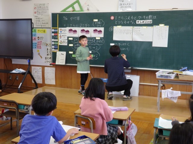 2年生の1時間目は算数の授業でした。かけ算の学習です。前の時間でノートに書いた振り返りに、しっかりと自分の考えを書けている子がたくさんいました。今日の学習では黒板に縦3つ、横4つに並べられたケーキの絵が貼られました。その絵を見て「3×4」と「4×3」の2つの式を導き出しました。さらに「答えが12になる式」はどんなものがあるのか考えました。足し算や他の段のかけ算で考え、たくさんの意見が発表されました。聞く姿勢もいいですね。