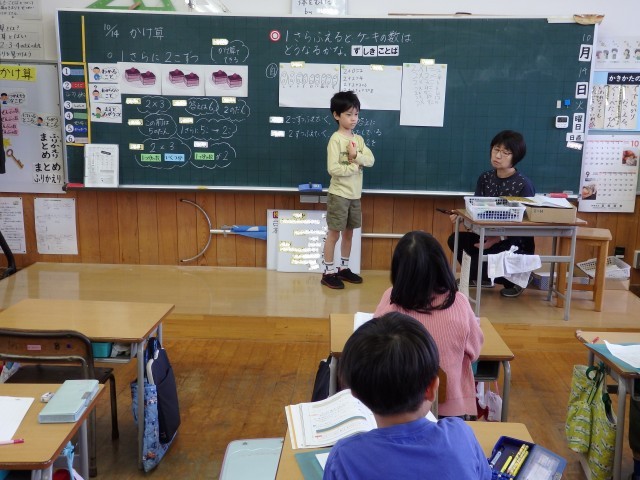 2年生の1時間目は算数の授業でした。皿の上にケーキが2個乗っている絵が貼られました。それが1枚、また1枚と増えていきます。子どもたちが「かけ算でできそう」と考え、1皿ずつ増えていくとケーキの数はどうなっていくのかを図や式とことばで自分の考えをノートに書いていきました。ケーキが乗った皿を9枚書いたり、「2+2=4、2+2+2=3・・・」と書いたり、早くもかけ算を書いたりしている子がいました。次の時間は2の段のかけ算の学習です。