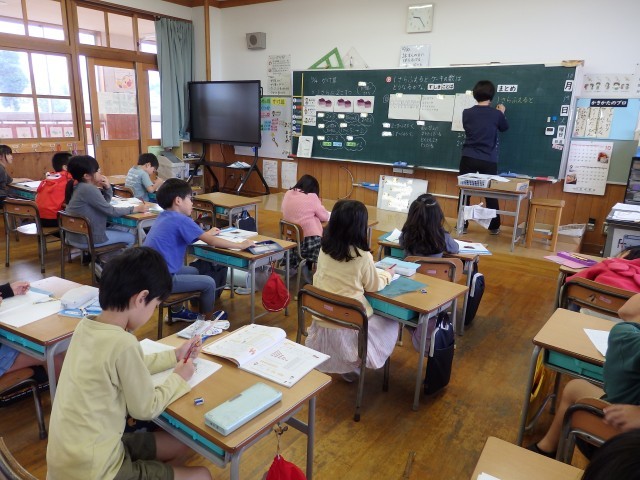 2年生の4時間目は算数の授業でした。水のかさの学習です。「ペットボトルに1L3dL、ビンに2L5dLの水が入っています。合わせた水のかさは?」という問題に取り組んでいました。発言がどんどんつながり、「単位をそろえて計算する」「単位ごとに計算する」ことが分かりました。また、そこから「長さの計算と同じだ」ということも分かりました。姿勢良く話が聞けている子がいました。いいですね!