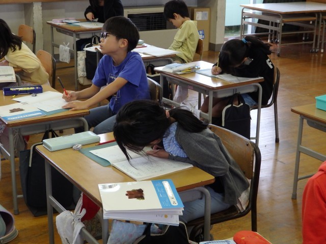 2年生の5時間目は国語の授業でした。ドリルを使って漢字の学習です。「万」「切」「語」などの漢字を学習しました。「万」の例文で「万年筆」という子どもたちには馴染みのないことばが出てきたので、先生が自分の万年筆を見せて紹介していました。その後、空書きで書き順を確認してから、ドリルで書く練習をしていきました。