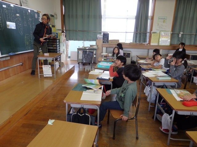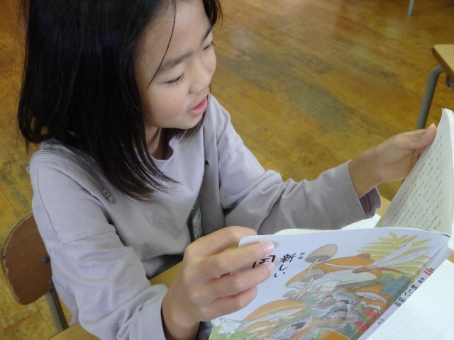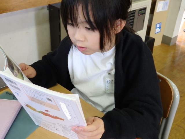 1,2年生の朝は読み聞かせを行いました。身を乗り出して絵本の世界に没頭している子がいました。