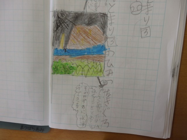 2年生の3時間目は図工の授業でした。夏休みの思い出を描いていますが、絵の具で色塗りです。クレヨンで塗ってから絵の具で塗ったり、フエルトペンで線を太くしてから塗ったりと工夫していました。