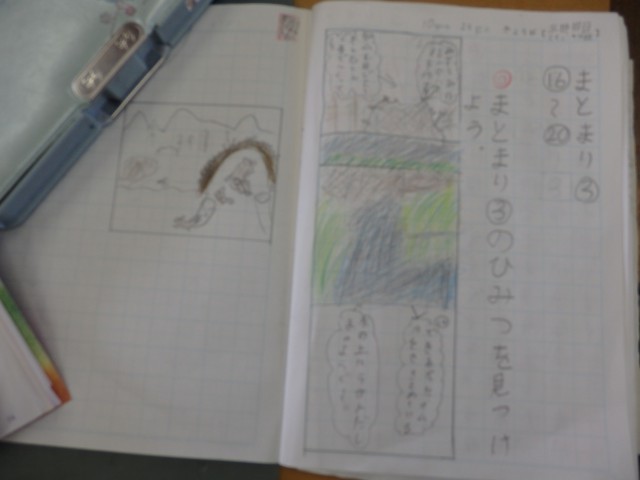 2年生の1時間目は国語の授業でした。「ビーバーの大工事」の学習です。まずは、先生がノート点検をしたうち、ていねいに見やすく書いてあるこのノートがみんなに紹介されました。続いて、教科書の音読です。今日は耳を塞いで自分の声に集中して音読しました。その後、ビーバーがどんなふうにダムをつくっているのかを読み取っていきました。「○段落目に~と書いてあります」のように教科書に書かれている文で考えることができました。