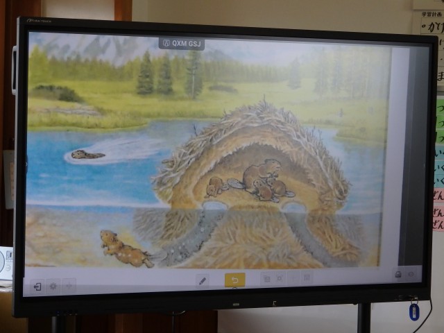 2年生の1時間目は国語の授業でした。「ビーバーの大工事」の学習です。まずは丸読みで音読をしました。1人ずつ順番に読んでいきます。読んでいきながら「木の幹」や「のみ」など、「これ何?」と思うような子どもたちにとって馴染みのないことばについて先生が説明していきました。音読が終わったら、やはり子どもたちにとってあまり馴染みのないビーバーについて、「どんな動物なのか」「どんな生活をしていのか」を動画を見て確かめました。