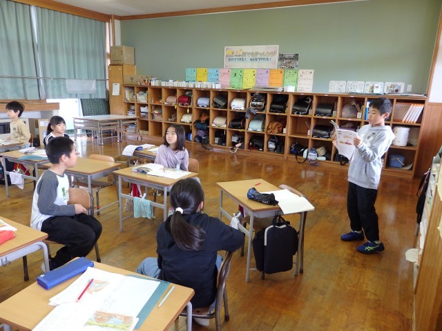 2年生の5時間目は学活の授業でした。学習発表会での劇のセリフの確認をしました。自分の席に座ってセリフだけで通してみます。もう台本を見ないでもセリフを言えますね。あとは他の人のセリフをよく聞いて、自分の言うタイミングを逃さないことですね。