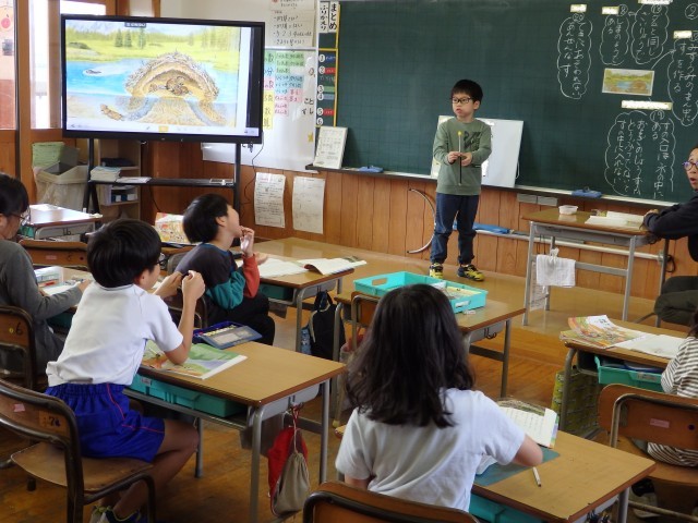2年生の2時間目は国語の授業でした。市教委にある学習指導センターの指導主事から授業を見ていただく職員研修としての授業です。「ニャーゴ」の学習です。まずは先生からクイズです。「ク~イズ、クイズ」と先生が歌うと「な~んののクイズ」と続けて歌う子どもたち。楽しそうですね。4枚の絵が貼られ、そのうちのどれが第3場面の絵なのか考えました。その後、第3場面を音読してから、その中で好きな場面を発表していきました。「子ネズミと一緒に桃を食べていたのに、たまが急に怖い顔になったから」と物語で書かれている文をもとに発表していきました。