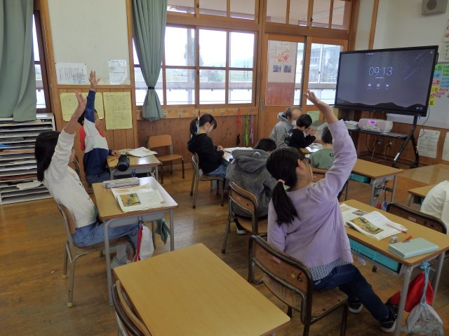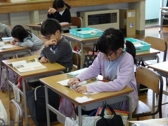 1,2年生の朝は読み聞かせを行いました。身を乗り出して絵本の世界に没頭している子がいました。