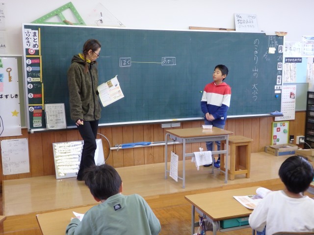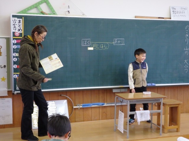 2年生の4時間目は国語の授業でした。「ビーバーの大工事」の学習です。第1場面の9個の段落を読み取りをしました。まずは先生が教科書の挿絵になっているビーバーの写真を10枚黒板に貼りました。10枚の中から第1場面で書かれていることに関係がある写真を選び、さらにどの段落の内容を表しているのかを何度も教科書を読み返しながら考えました。
