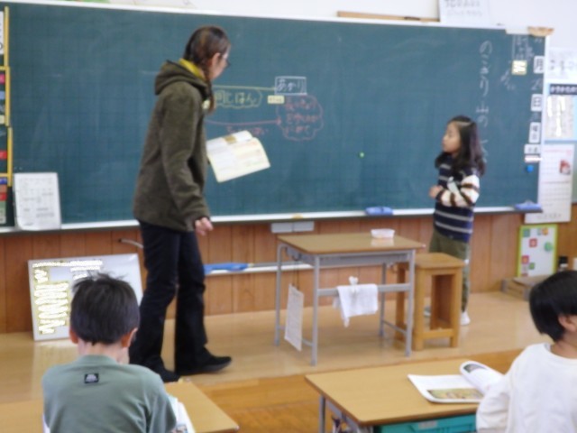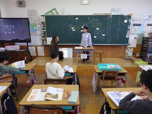 2年生の2時間目は国語の授業でした。市教委にある学習指導センターの指導主事から授業を見ていただく職員研修としての授業です。「ニャーゴ」の学習です。まずは先生からクイズです。「ク~イズ、クイズ」と先生が歌うと「な~んののクイズ」と続けて歌う子どもたち。楽しそうですね。4枚の絵が貼られ、そのうちのどれが第3場面の絵なのか考えました。その後、第3場面を音読してから、その中で好きな場面を発表していきました。「子ネズミと一緒に桃を食べていたのに、たまが急に怖い顔になったから」と物語で書かれている文をもとに発表していきました。