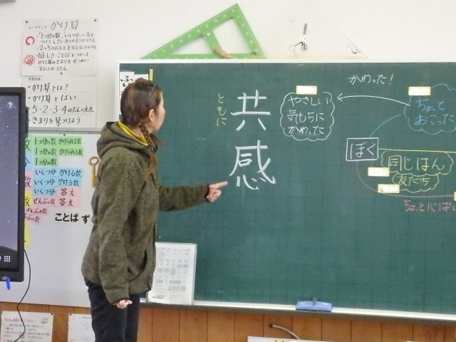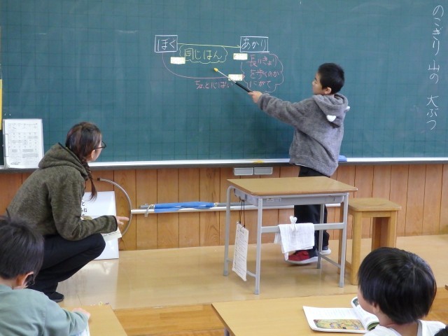 2年生の2時間目は国語の授業でした。「漢字を使おう」の学習です。「大きい」「小さい」「男の子」「女の子」「本」など、1年生で学習した漢字を使って文を作っていました。とても一生懸命に取り組んでいて、時間になっても「もっと文、作りたい!」と先生にお願いする子どもたちでした。