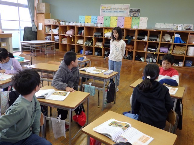 2年生の5時間目は学活の授業でした。学習発表会での劇のセリフの確認をしました。自分の席に座ってセリフだけで通してみます。もう台本を見ないでもセリフを言えますね。あとは他の人のセリフをよく聞いて、自分の言うタイミングを逃さないことですね。