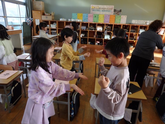 2年生の3時間目は第2体育館で学習発表会の練習をしました。有名なあの曲に合わせてダンスをするシーンがあります。みんなで1列になって踊りました。くるくる回ったり、手をつないでゆらゆら揺れたりと楽しそうでした。