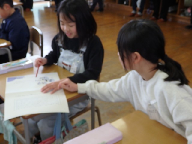 2年生の5時間目は図書館で読書をしました。2冊本を選んで借りて読みました。石ノ森章太郎の本を借りて2人で一緒に読んでいる子がいました。仮面ライダーやキカイダーなど私が小学生の時に見ていたヒーローが登場していました。また、金魚の図鑑を一緒に見て、「この中だったらどれがいい?」と選び合っている子たちもいました。図書室なので小さな声でしたが、とっても上手に音読している子がいました。