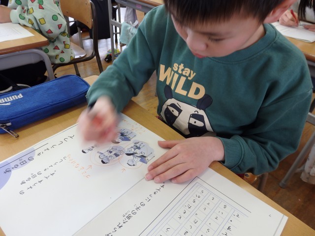 2年生の4時間目は国語の授業でした。3時間目に続いての漢字の学習ですが、今度はクイズ形式の問題です。「日と月を合わせた漢字」のように2つの漢字を合わせた漢字一文字を考えたり、「名人の名まえをよんだ」のように同じ漢字でも異なる読み方を考えたりしました。「空き家」の読み方で悩んでいる子が多かったのですが、先生が『すき家』と黒板に書いて、「何て読む?」というヒントで全員、答えが分かりました。