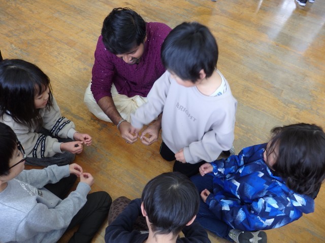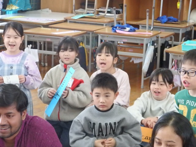 2年生の3時間目は国際大学生を招いての国際交流会でした。まずは1人ずつ順番に自己紹介です。自分の名前と「自分ができること」を英語で伝えました。その後、「ずいずいずっころばし」「なべ、なべ、そこぬけ」「あんたがたどこさ」の3つの童歌で遊びました。まずグループでそれぞれの童歌でどんなことをするのかデモンストレーションをしました。みんなで一緒に歌いながら紹介しました。そして、各グループに1人ずつ国際大学生に入ってもらい、一緒に遊びました。
