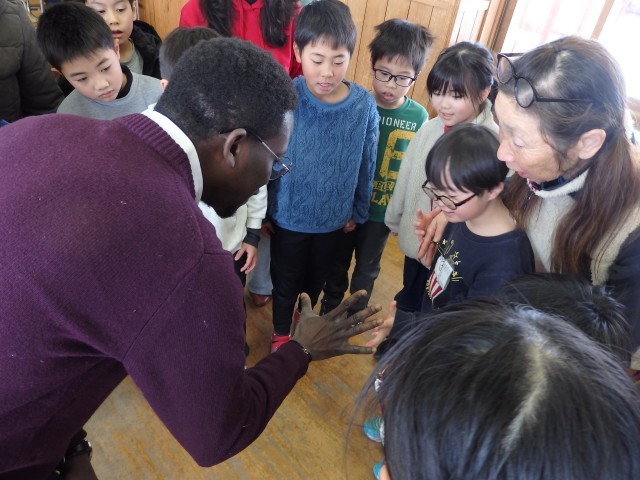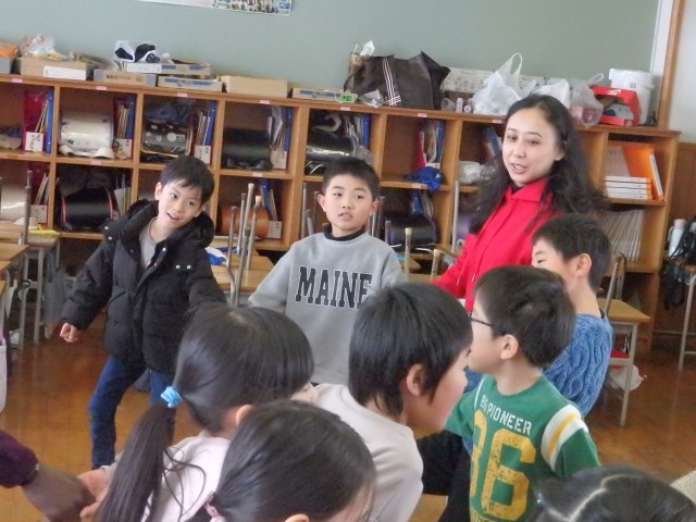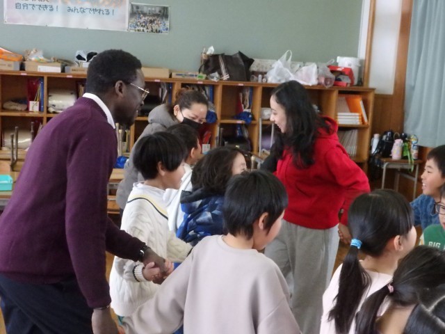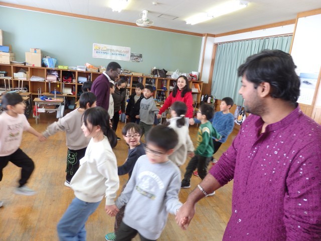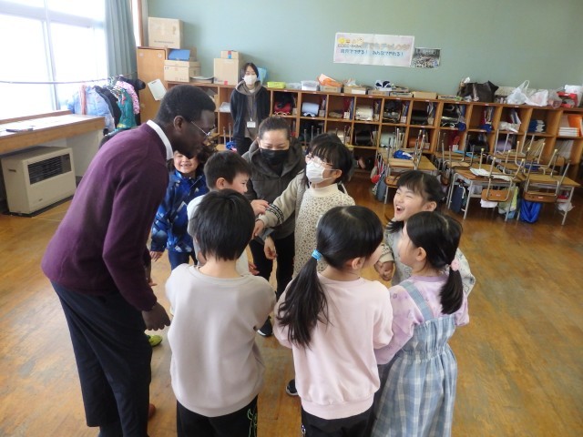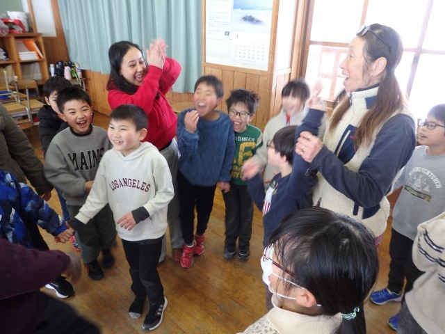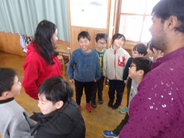 2年生の国際交流会、さいごは「かごめかごめ」です。「あのこがほしい」ジャンケンで勝ったチームは大喜びでした。国際大学生と一緒に遊べて、あっという間の45分間でした。