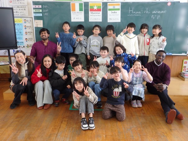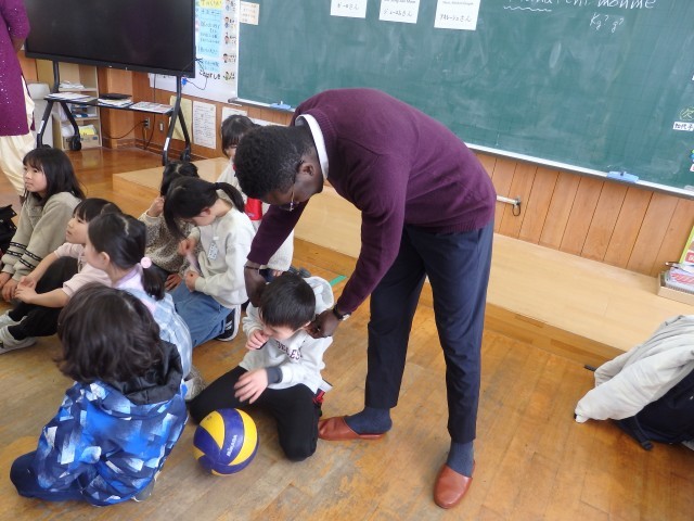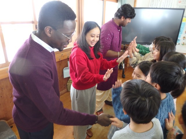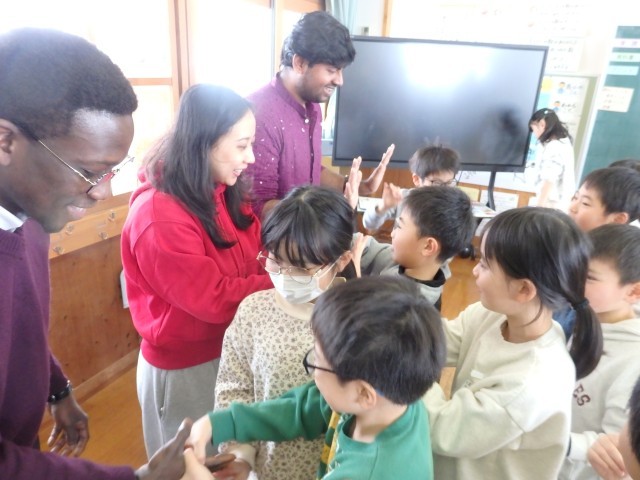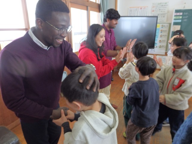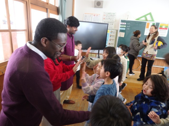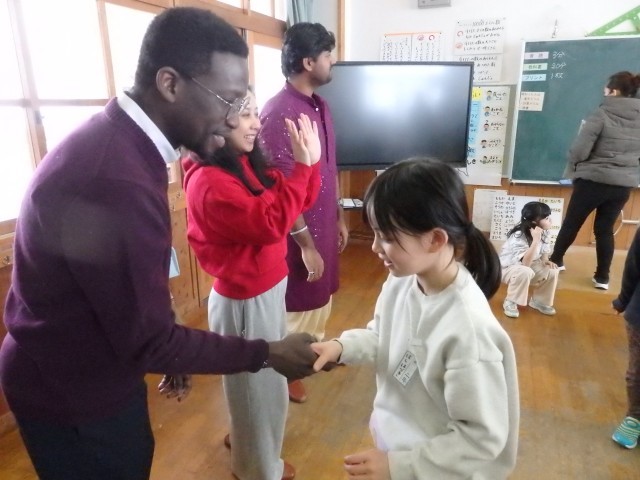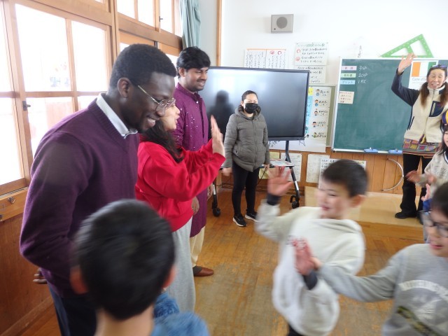 2年生の国際交流会、さいごは「かごめかごめ」です。「あのこがほしい」ジャンケンで勝ったチームは大喜びでした。国際大学生と一緒に遊べて、あっという間の45分間でした。