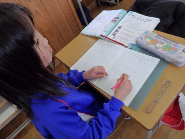 2年生の5時間目は国語の授業でした。「くらべてつたえよう」のまとめの学習です。「ランドセルとリュック」など2つの物を比べて、その違いなどを説明する文を書いています。早く終わった子は国語のワークに取り組んでいました。