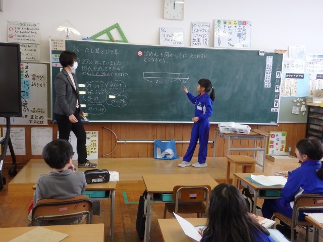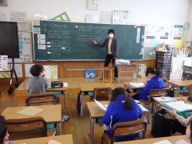 2年生の4時間目は算数の授業でした。「足し算と引き算」の学習です。「バスに27人乗っていました。何人か乗ってきたので34人になりました。」という文から、「分からない数は何か」を考え、テープ図で表していきました。問題文で何が問われているのかを正し読み取ることが大切です。