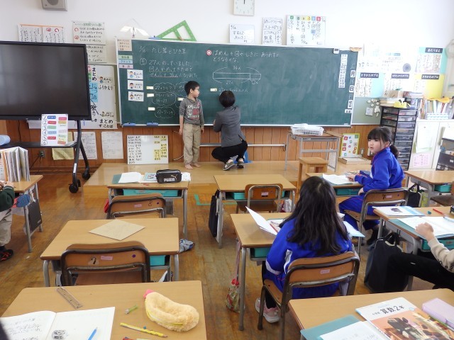 2年生の2時間目は算数の授業でした。「長さ」の学習です。「床から黒板の下までが90cm、黒板の縦の長さが1m20cmです。床から黒板の上までの長さは何cmですか」という問題に取り組んでいました。すぐに子どもたちから「足し算すればいい」という意見が出され、さらに「もう考えをノートに書いていいですか」という声も出ていました。1m20cmを120cmに直して筆算したり、位取り表を使って計算したり、さくらんぼ算のようにして計算していました。