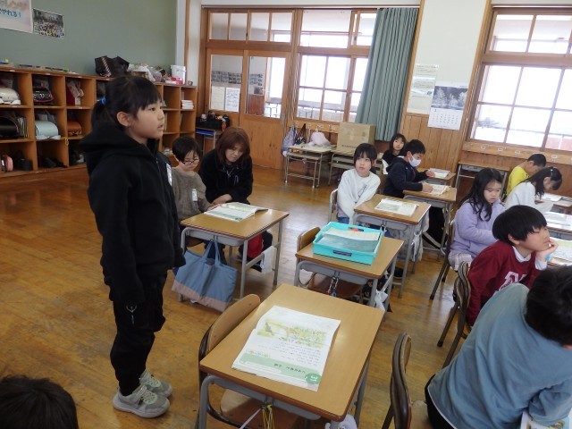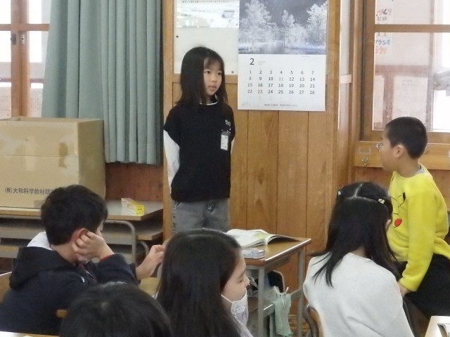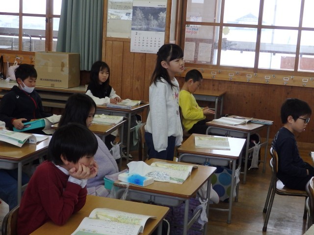 2年生の2時間目は国語の授業でした。「宝物を紹介しよう」の学習です。前の時間までで書いた、自分の宝物について紹介する作文をみんなの前で発表しました。原稿を全く見ないで、しっかりみんなの方を見て上手に発表できた子がいました。何度も読んで練習したんだそうです。すごいですね。作文の構成で、「はじめ」では「宝物は何か」を、「中」では「どんな物か」を、「終わり」では「これからどうしたいか」という内容で書かれていました。
