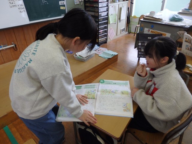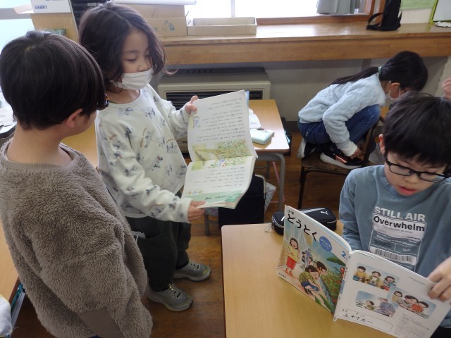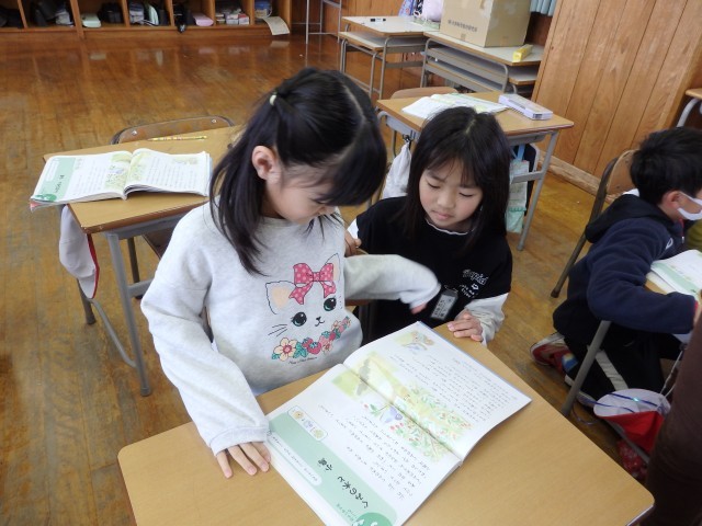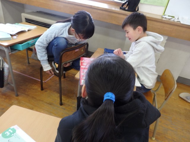2年生の1時間目は国語の授業でした。「あなのやくわり」の学習です。まずは班ごとになって教科書を丸読みしていきました。読み飛ばしがないように指で字を追いながら読んでいる子がいました。大事な工夫ですね。タイトルの脇に「正」の字が2つ書いてあり、すでに10回も音読した子が何人もいました。先生からシールをゲットです。その後、学習プリントを使って「プラグの穴の役割」についての読み取りを班ごとで教え合いながら取り組みました。