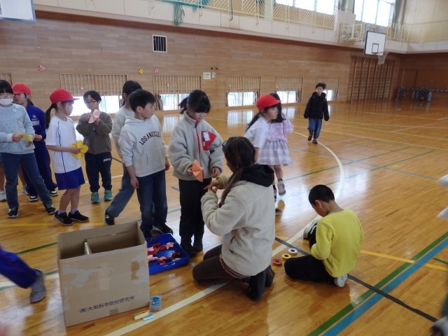 2年生の3時間目は生活の授業でした。「ぱたぱたカー」や「びゅんびゅんカー」、「ゴムロケット」などの動くおもちゃを作っていました。教科書やiPadで作り方を確認しながら、チームで協力して作っていました。できあがったおもちゃで2月の新1年生体験入学のときに新1年生と一緒に遊びます。楽しみですね。