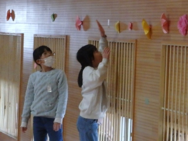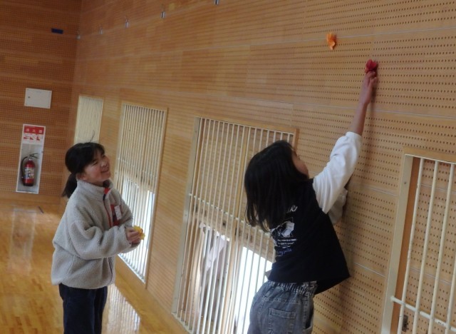 3時間目に1,2年生が協力して、明日の「6年生を送る会」のために体育移管の飾り付けをしてくれました。前半は1,2年生で協力して、折り紙で作ったチェーンや花を壁やステージ周りに貼りました。後半は2年生だけで両脇の壁に紙テープで飾りを付けていきました。