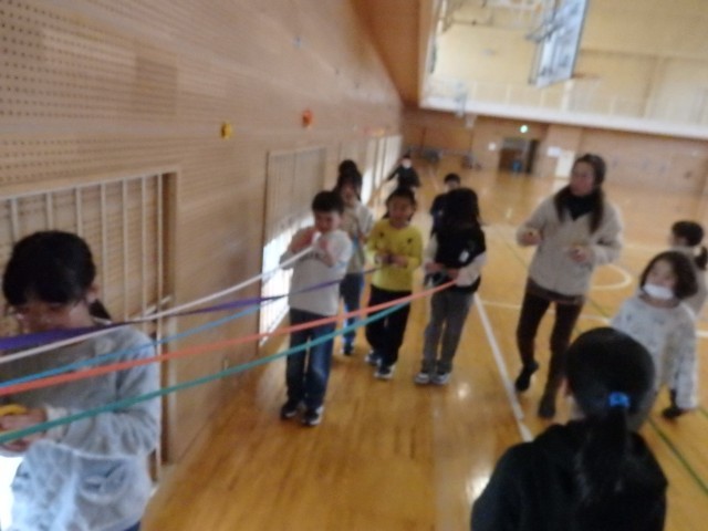 2年生の国際交流会、さいごは「かごめかごめ」です。「あのこがほしい」ジャンケンで勝ったチームは大喜びでした。国際大学生と一緒に遊べて、あっという間の45分間でした。