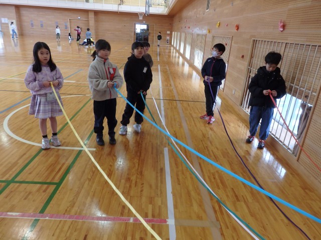 2年生の4時間目は体育の授業でした。縄跳びの学習です。「大波小波」のようにして先生が大縄を回して跳んでいきます。前半は4,5人グループで手を繋いで跳びます。みんなで掛け声を掛けて、息を合わせて跳んでいました。後半は1人からスタートし、1人ずつ大縄に入っていきます。とっても楽しそうに跳んでいました。