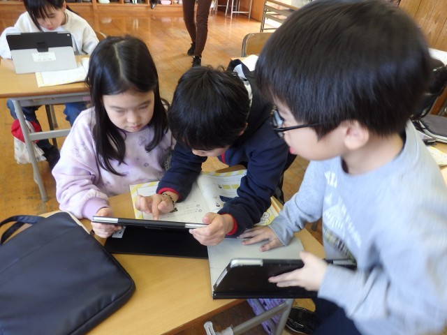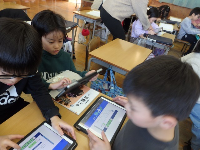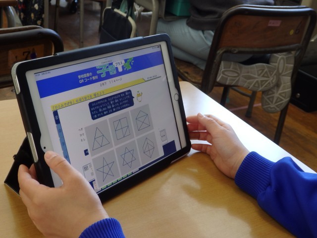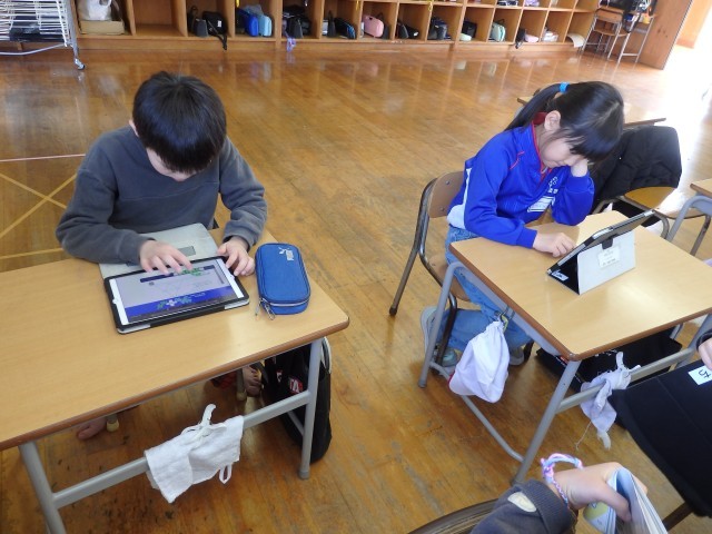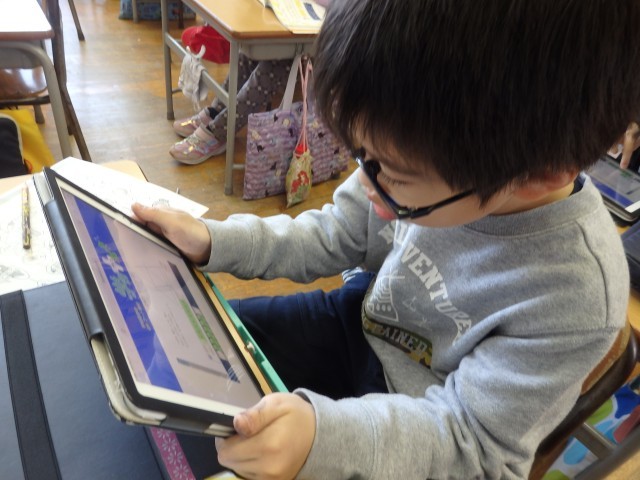 2年生の4時間目は算数の授業でした。iPadを使って図解の学習です。1枚目の写真の子は何をしているか分かりますでしょうか?2枚目の写真のような複雑な図形をどうやったら一筆書きできるか一生懸命考えているところです。デジタル教科書でプログラミング学習の一つとして載っている「図形の一筆書き」に取り組んでいました。「やった!できた!」とバンザイやガッツポーズをして喜ぶ子どもたちでした。