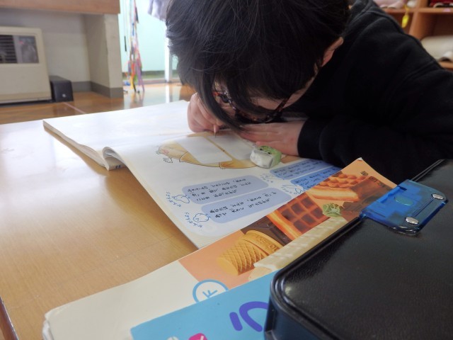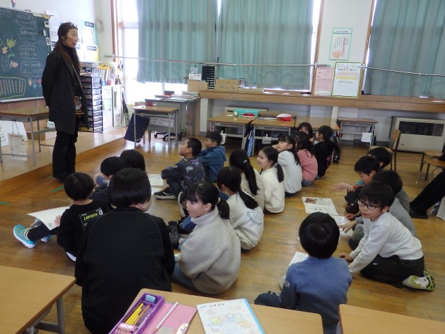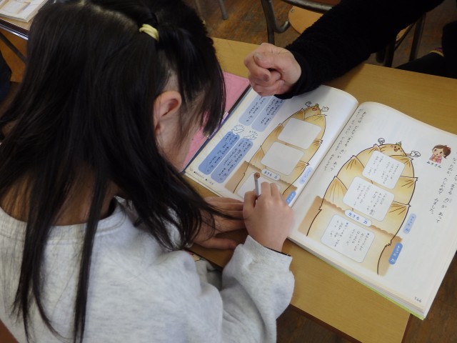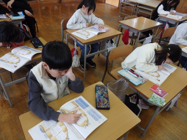 2年生の1時間目は国語の授業でした。「お手紙」という物語の学習です。まずは2,3人のグループになって丸読みをしました。その後、物語全体を4つの場面に分け、それぞれの場面がどういうお話なのかを読み取りました。友だちと協力して取り組んでいました。