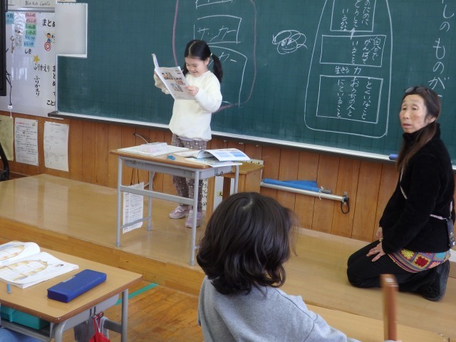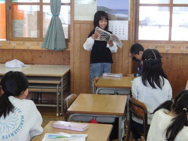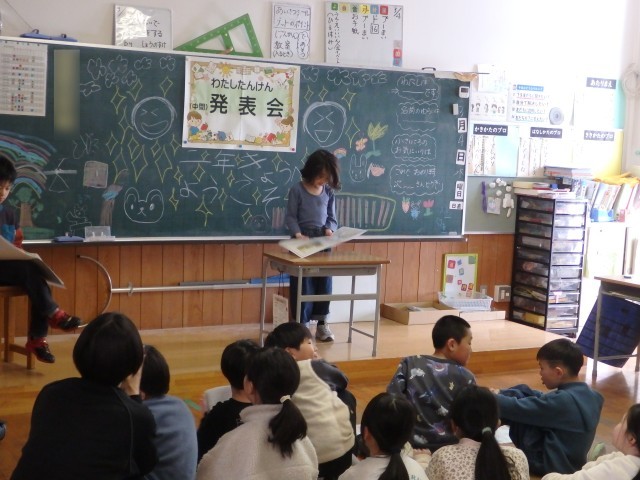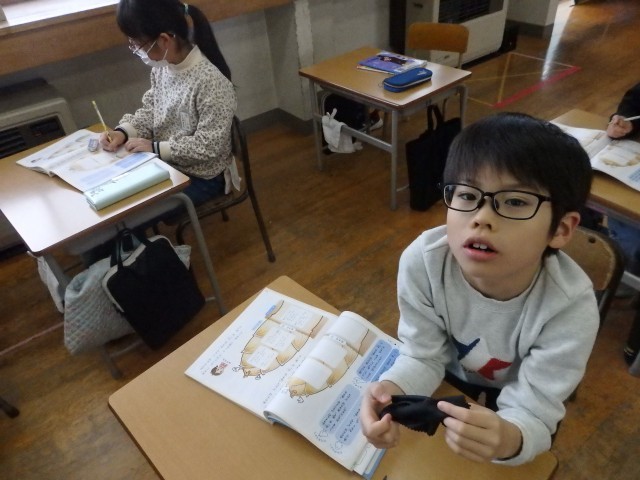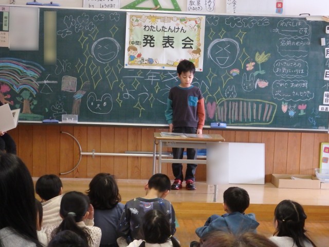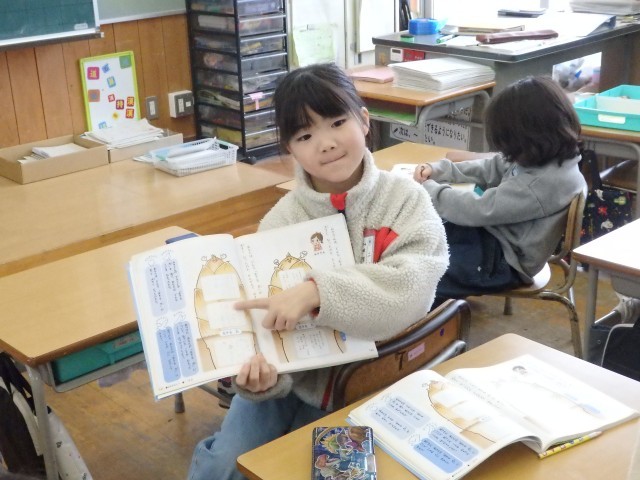 2年生の2時間目は国語の授業でした。「宝物を紹介しよう」の学習です。前の時間までで書いた、自分の宝物について紹介する作文をみんなの前で発表しました。原稿を全く見ないで、しっかりみんなの方を見て上手に発表できた子がいました。何度も読んで練習したんだそうです。すごいですね。作文の構成で、「はじめ」では「宝物は何か」を、「中」では「どんな物か」を、「終わり」では「これからどうしたいか」という内容で書かれていました。