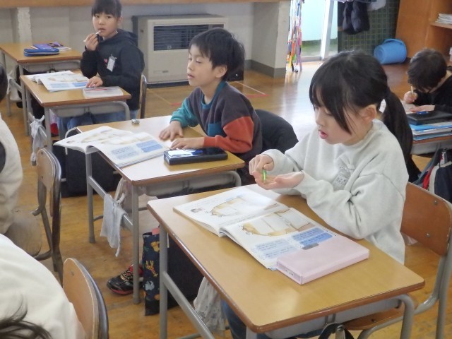 2年生の2時間目は国語の授業でした。「あなのやくわり」の学習です。まずは班ごとになって丸読みです。今日は読むときは立って読むルールで行っていました。その後、まとめの活動として、身の回りにある穴があいている物を探して、その役割について「はじめ」「中」「おわり」を意識して文を書き、発表しました。かたつむりの甲羅、CD、水筒、ドーナッツ、ラップの芯、イヤホンなどの穴があいている物を探すことができました。