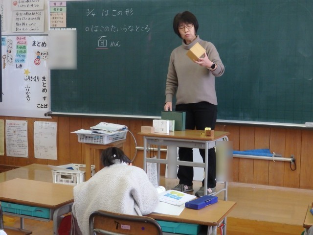 2年生の2時間目は算数の授業でした。「はこのかたち」という立体の学習です。箱の平らなところを「面」ということを学びました。その上で1人1人が「細長い箱」や「サイコロの箱」から好きな箱を選んで、それぞれの面の形を紙に写していきました。1つの箱を書き終わったら「次はこの箱書きたい!」ととても意欲的な子どもたちでした。