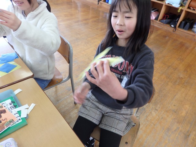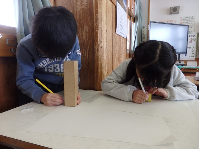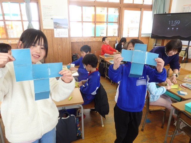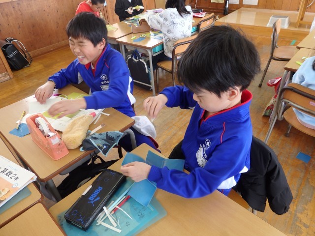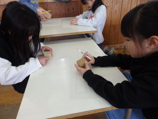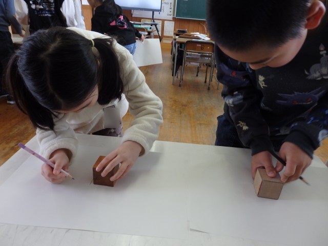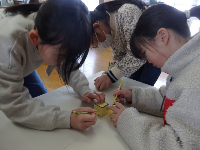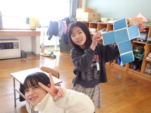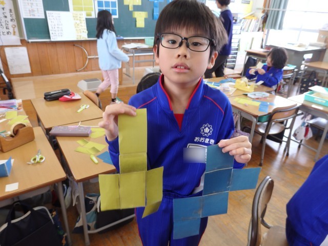 2年生の4時間目は算数の授業でした。「はこの形」の学習です。四角形が6つ描かれている2種類のプリントが配られました。1つは全部正方形で、もう1つは長方形が4つと正方形が2つです。それぞれ、四角形をどのようにつなげたら箱ができるのか考え、貼り合わせていきました。上の学年で学習する展開図をつくります。試行錯誤して完成させた子が「できた!」ととてもうれしそうでした。