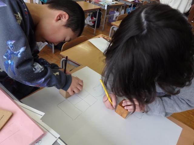 2年生の5時間目は図工の授業でした。紙版画の制作です。下書きの絵が終わった子がいるので、まずは先生が凸凹が付いた紙やプチプチを使った模様の付け方を説明しました。説明を聞いたら、各自が自分の進度に合わせて活動です。どんな絵にするか悩む子、鉛筆で下書きをする子、ネームペンで下書きをなぞる子、模様を考える子と熱心に取り組んでいました。