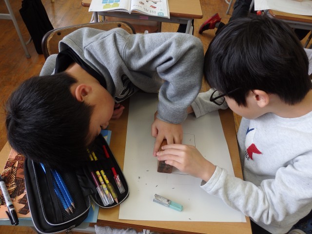 2年生の5時間目は図工の授業でした。紙版画を作っています。自分が何かをしているところを紙版画で描きます。版ができあがった子から刷る作業に入りました。先生からインクを塗ってもらったら、紙をセットしてバレンでこすります。刷り上がった自分の作品に満足そうな笑顔の子どもたちでした。